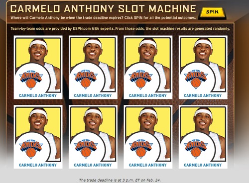 ESPN.com has a new feature called the Carmelo Anthony Slot Machine. It may be the worst idea since Katy Perry married Russell Brand and I have no idea how it works. I just spun the wheel and got 4 Knicks Carmelos, 3 Nuggets Carmelos, and 1 Lakers Carmelo. What does that mean? Are we cloning Carmelo Anthony and having the greatest trade in NBA history when he gets traded for himself? Here’s the link. If anyone figures it out, let me know.