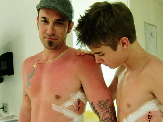 Justin Bieber and his dad, Jeremy, who looks like a huge toolbag, recently did what all loving fathers and sons do: got matching tattoos. The Biebs crew tatted their rib cages with “Jesus” written in Hebrew because…well, they’re huge toolbags. How great is life if you’re Jeremy Bieber? If it wasn’t for your son, you’d probably be working at Wal-Mart and drinking Natty Lights all day. Now, all you have to worry about is drinking Natty Lights all day. He seems like the type of guy that would get an Affliction logo tattoo. One thing’s for sure, when I have a kid I’m teaching him how to sing.