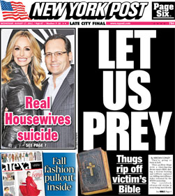The other day some guy from one of the Real Housewives shows committed suicide. I’m far too uninterested and lazy to get all the details but it made the front page of both New York tabloids. This is not real news. This isn’t even good gossip news. Put Arnold Schwarzenegger on the cover when he knocks up his fugly housekeeper, not when Slutty McWhore’s husband hangs himself because she wants the money and the kids. I might expect this from the Post but not the Daily News. It’s a shame if they think this crap sells paper, and it’s a bigger shame if it actually does.