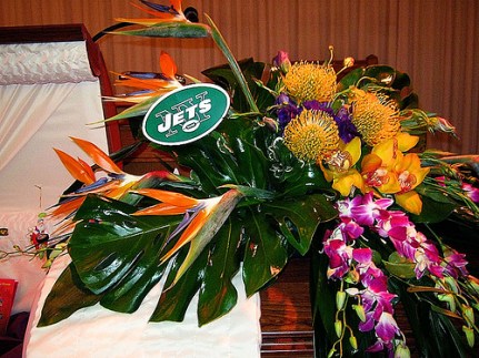 Here it is. A new low. A dead Jabroni. I know I’m going to hell for making fun of a dead guy but what the fuck. Russell Francis was a lifelong Jets fan. That’s enough to be a Jabroni, but while he was gravely ill with lung cancer, Francis boldly predicted Gang Green would get Tim Tebow. He passed away and lo and behold, Tebow ended up on the J-E-T-S. So to honor Francis, his family buried him in a brand new Tim Tebow Jets jersey.